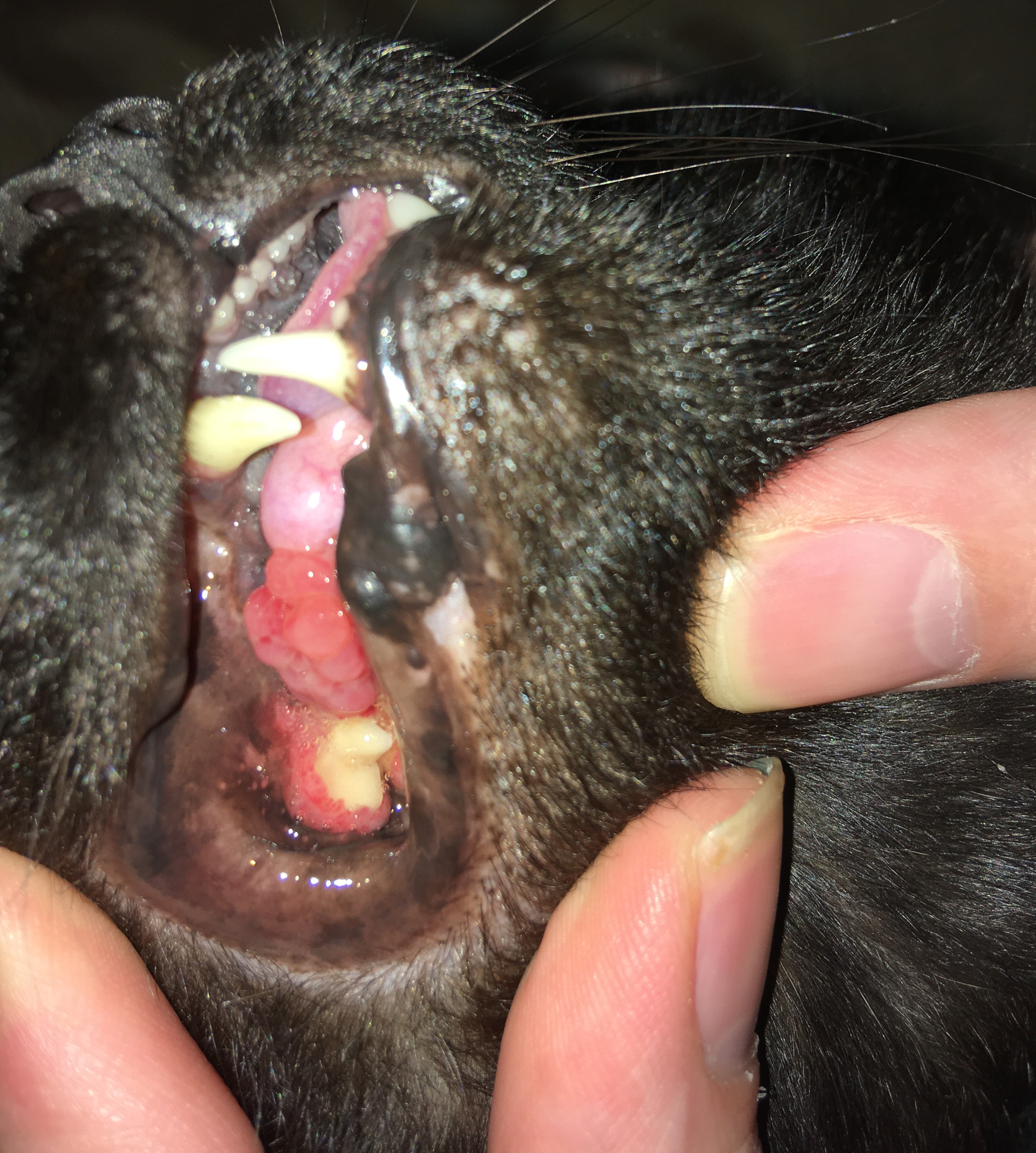 Кошка в возрасте 10 лет. Опухоль ротовой полости (рак).