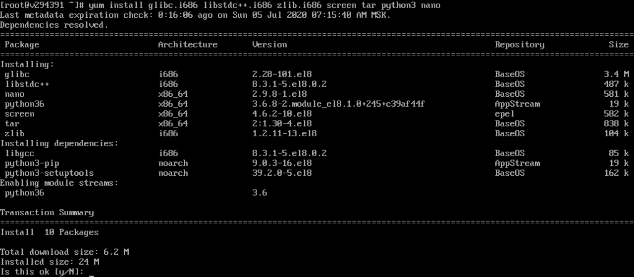 yum install glibc.i686 libstdc++.i686 zlib.i686 screen tar python3 nano